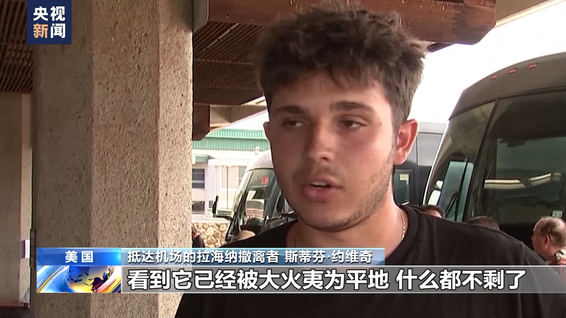 抵达机场的拉海纳撤离者 斯蒂芬·约维奇:我今天(10日)开车穿过拉海纳,看到它已经被大火夷为平地,什么都不剩了,整座城镇就像是消失了。晚上你能看到天上有巨大的橘色闪光,从这就能看出情况很严重。