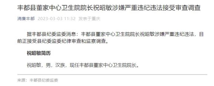 在丰都县纪委监委微信公众号“清廉丰都”上,今年以来,该县曾分别于3月和5月通报了丰都县董家中心卫生院院长祝昭敏,以及丰都县包鸾中心卫生院党支部书记、院长霍秋名被查的消息。