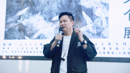 学术主持周瑟瑟在展览前言中写道:“周艺文的艺术创作承载了诸多人类精神与文化命题,他的艺术首先来自于他生命的源头——母语文明,然后走向更加广阔的世界。爱、和平与环保的艺术不是主题先行的创作,而是从他生命里自然生长出来的当代艺术,因为作为诗人与童话作家的周艺文,他的内心柔软而悲悯。爱如滚滚热泪时常滑落到他的宣纸上,这是一个无法改变的事实。”