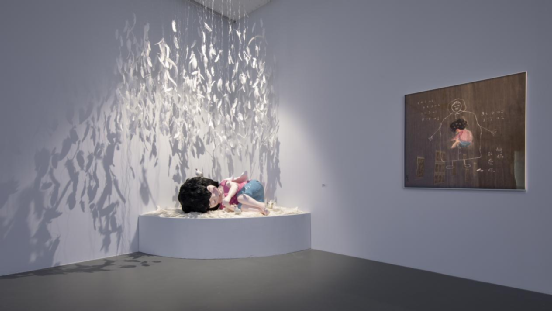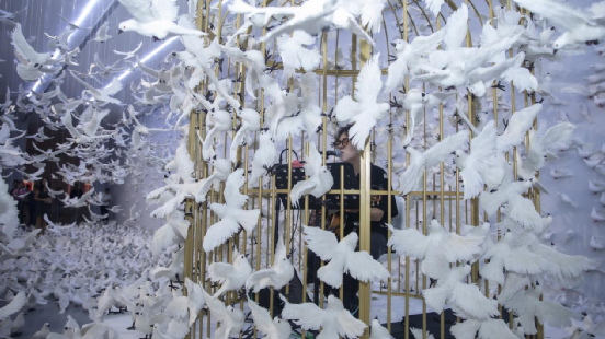 在“和平广场”架上绘画与大型装置艺术作品现场的一只巨大的鸟笼里,上海青年歌手Wey舒缓深情地演唱了《Blowin' In The Wind》(《答案在风中飘》)《Five Hundred Miles》(《离家五百英里》)《Viva La Vida》(《西班牙语:生命万岁》)《Hey Jude》(《嘿,朱迪》)等英文歌曲,鸟笼上与展厅里飞满了白色的鸽子。 这一架上绘画与大型装置艺术作品,对战争与和平的反思,架上绘画、纤维与羽毛装置、音乐与诗歌的综合运用,既温暖又令人不安、既激越又沉静,他的社会批判色彩与对战争中的儿童与母亲的抚慰,达到了内在的高度统一,他的艺术给人传递不屈的力量。
