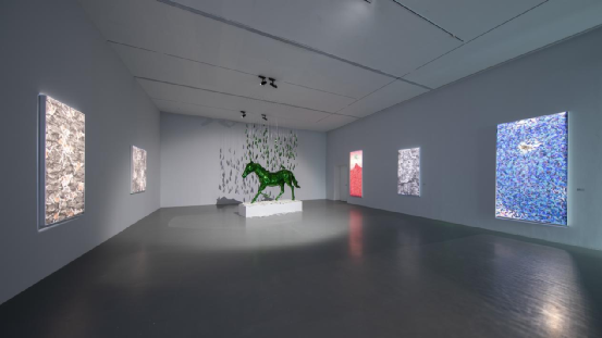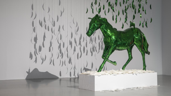 “绿马”架上绘画与雕塑艺术组合是周艺文近三年来最重要的作品之一,他改变了水和墨的形态与走向,水和墨的肌理,细腻柔软,而又雄壮辽阔,宇宙洪荒,巨大的人类的眼睛里一匹孤独的、通体碧绿的散发梦幻光泽的马。周艺文并不满足于架上绘画,而是将架上绘画用装置、数字多媒介、雕塑等形态重新创造出新的艺术。人和动物如何相处?艺术家通过架上绘画与立体雕塑,告诉了我们——人是动物的灵魂,动物是人的化身。