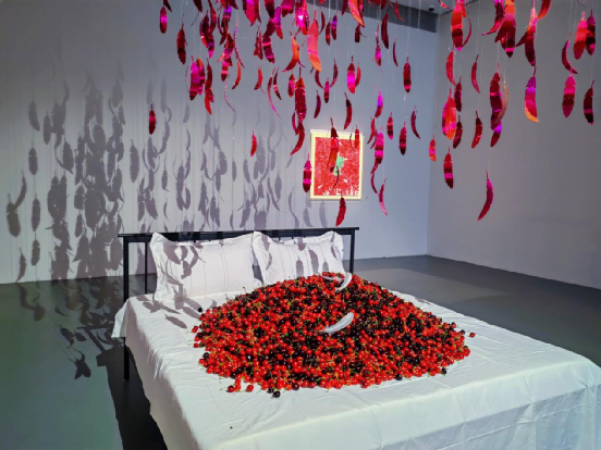“保鲜期”架上绘画与装置艺术作品回到了日常经验,在他的“樱桃”架上绘画的空间里,鲜艳的真实的樱桃,被他堆到了一张床上,在整个“1/2加1/2:周艺文个展”期间,这些鲜艳的樱桃将会经历怎样的变化?鲜活的生命在上海亚热带海洋性季风气候里,经过空气与时间的发酵,它们的结局一定是逐渐散发甜蜜的腐烂的气息,最后与这张白色的床、床单、枕头一起完成这个当代艺术作品。它给我们关于爱、两性关系与日常家庭生活的思考。