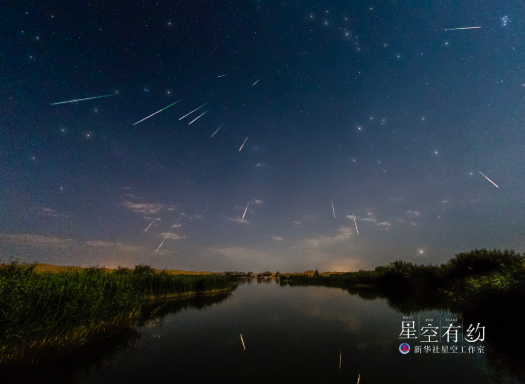 广西天文摄影爱好者罗弘扬2021年8月13日在甘肃酒泉拍摄的英仙座流星雨(多张叠加)。(本人供图)