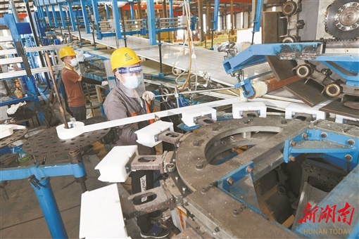 (2022年9月14日,湘潭固可得制造有限公司节能保温一体化金属幕墙生产线,生产人员在进行设备调试。湖南日报全媒体记者 田超 摄)
