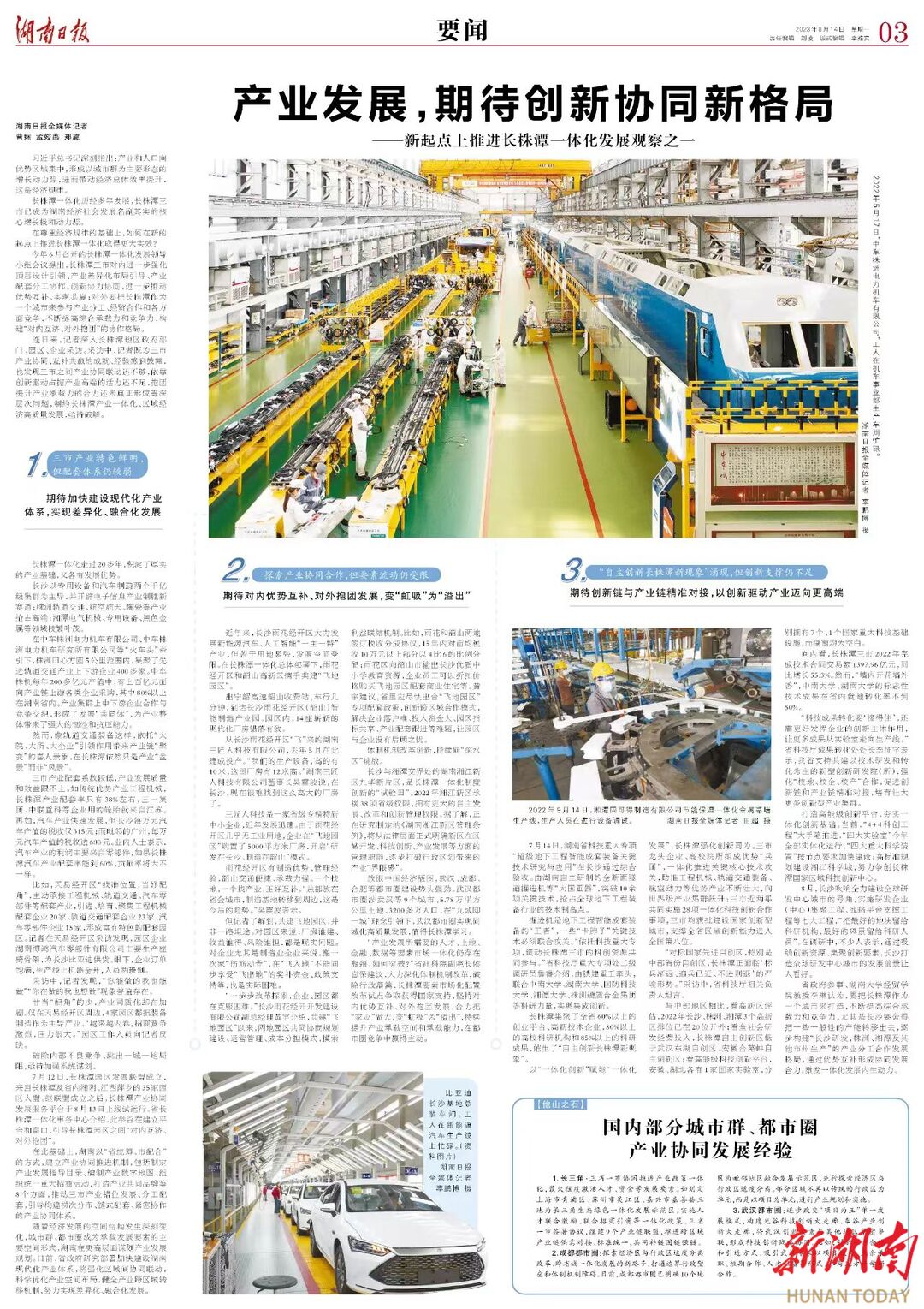 在此基础上,湖南以“省统筹、市配合”的方式,建立产业协同推进机制,包括制定产业发展指导目录、编制产业数字地图、组织统一重大招商活动、打造产业共同品牌等8个方面,推动三市产业错位发展、分工配套,引导构建梯次分布、链式配套、紧密协作的产业协同体系。