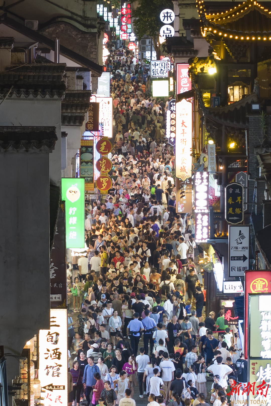 8月13日晚,长沙市天心区太平老街的古风建筑、历史文化与商铺、人流碰撞融合,呈现出赓续不绝的繁华盛景。湖南日报全媒体记者 辜鹏博 摄