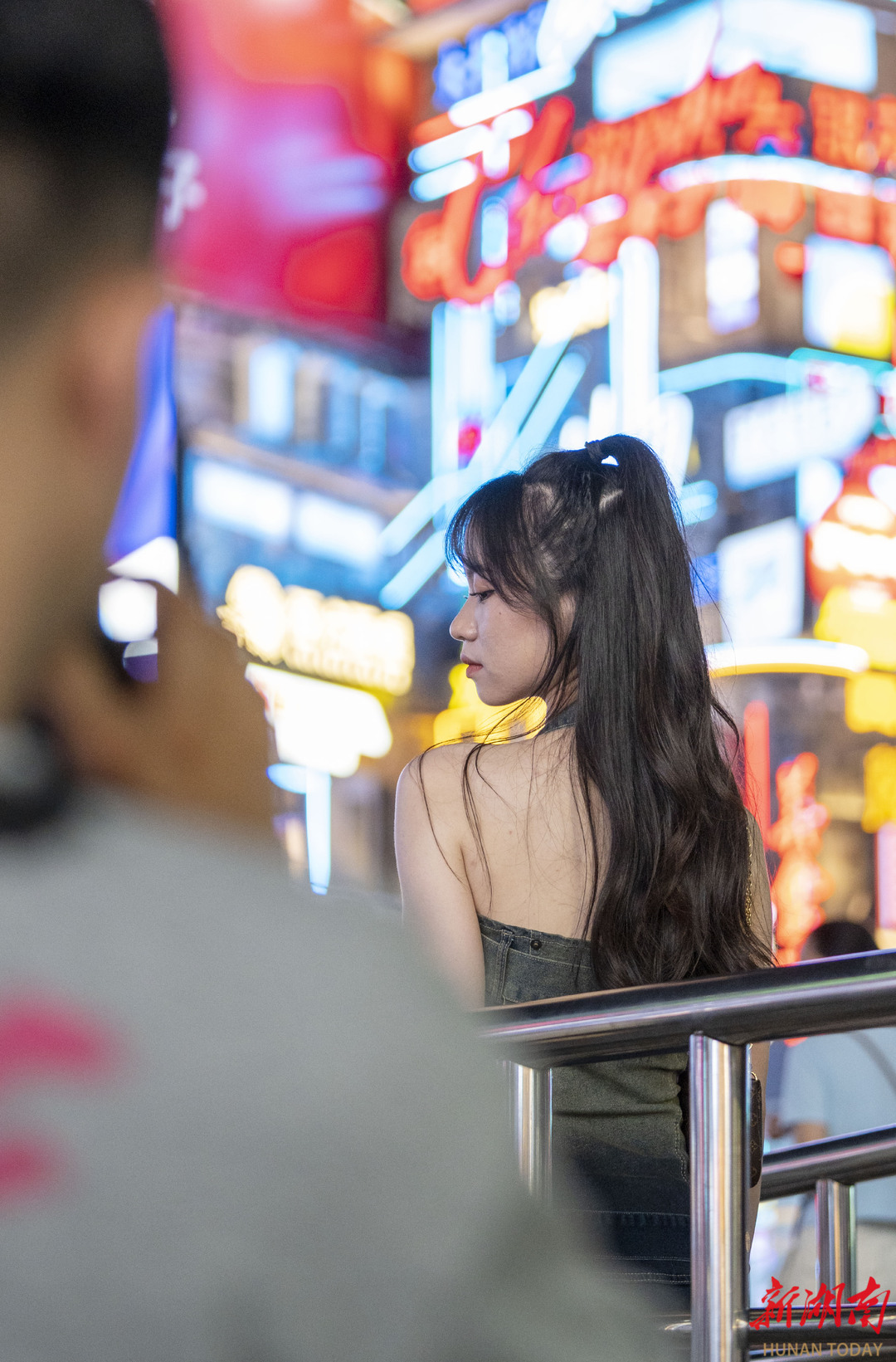 8月14日晚,长沙市天心区黄兴广场,游客在地铁站打卡拍照。湖南日报全媒体记者 辜鹏博 摄