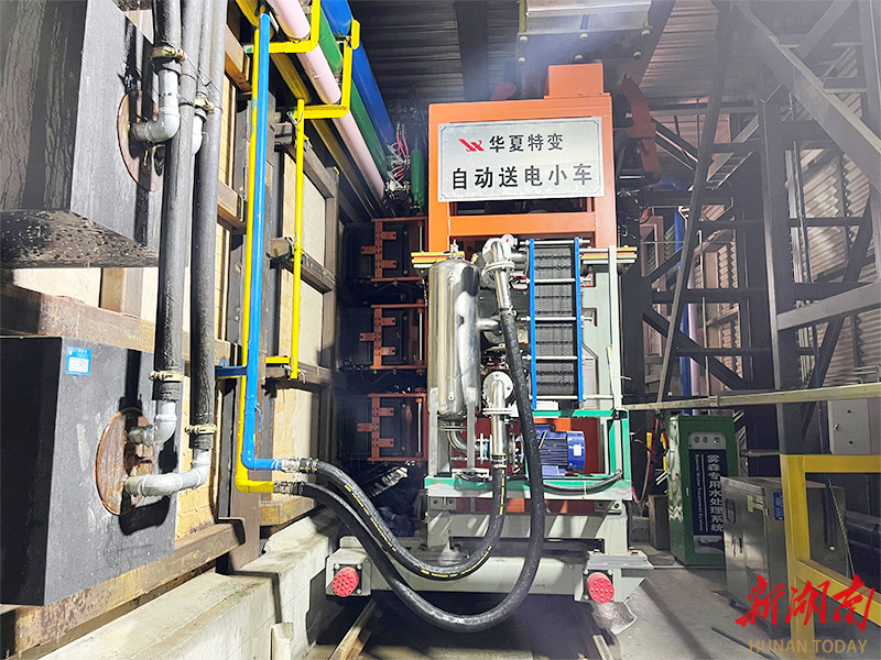 8月15日,湘潭华夏特种变压器公司,一台锂电负极材料石墨化炉专用自动送电小车,正在现场模拟给石墨化炉送电。