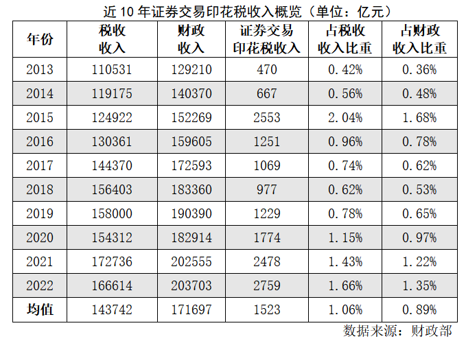 时间线拉长,最近十年(2013-2022年),证券交易印花税收入占税收收入比例仅为1.06%,占财政收入比例更是仅有0.89%。即便是在大牛市的2015年,证券交易印花税收入占税收收入、财政收入的比例也仅为2.04%、1.68%。