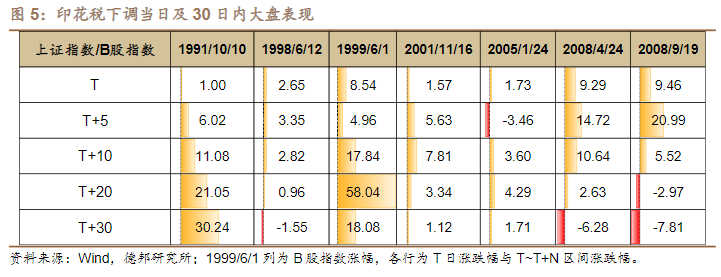 德邦证券研报亦称,复盘7次印花税税率下调可以发现,税率下调在短期内对市场有一定提振效应,但中长期影响或有限。
