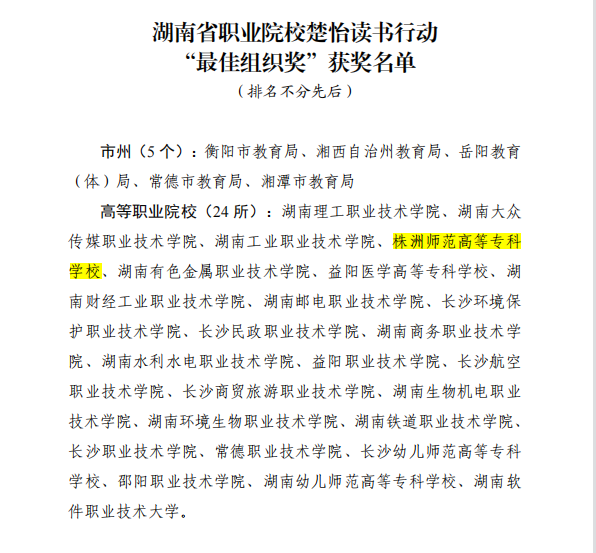 近日,湖南省教育厅发布《关于公布湖南省职业院校楚怡读书行动“主题征文”“楚怡读书之星”“最佳组织奖”评选结果的通知》(湘教通〔2023〕241号),株洲师范高等专科学校自升格以来首次参加省级读书类活动竞赛荣获“最佳组织奖”,师生10个作品参加读书征文活动9个作品获奖,取得一等奖3项、二等奖4项、三等奖2项,4名师生获评楚怡“读书之星”。