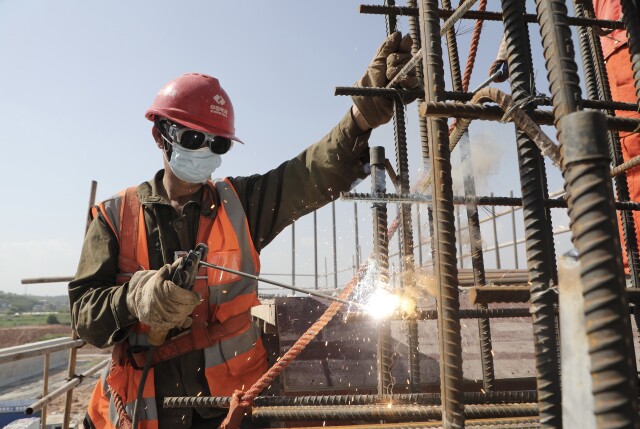 在37摄氏度的高温下,朱群希“全副武装”,戴着加厚防护手套,身穿长袖长裤,在进行钢筋焊接作业,汗水不断从脖子上流到衣服里。