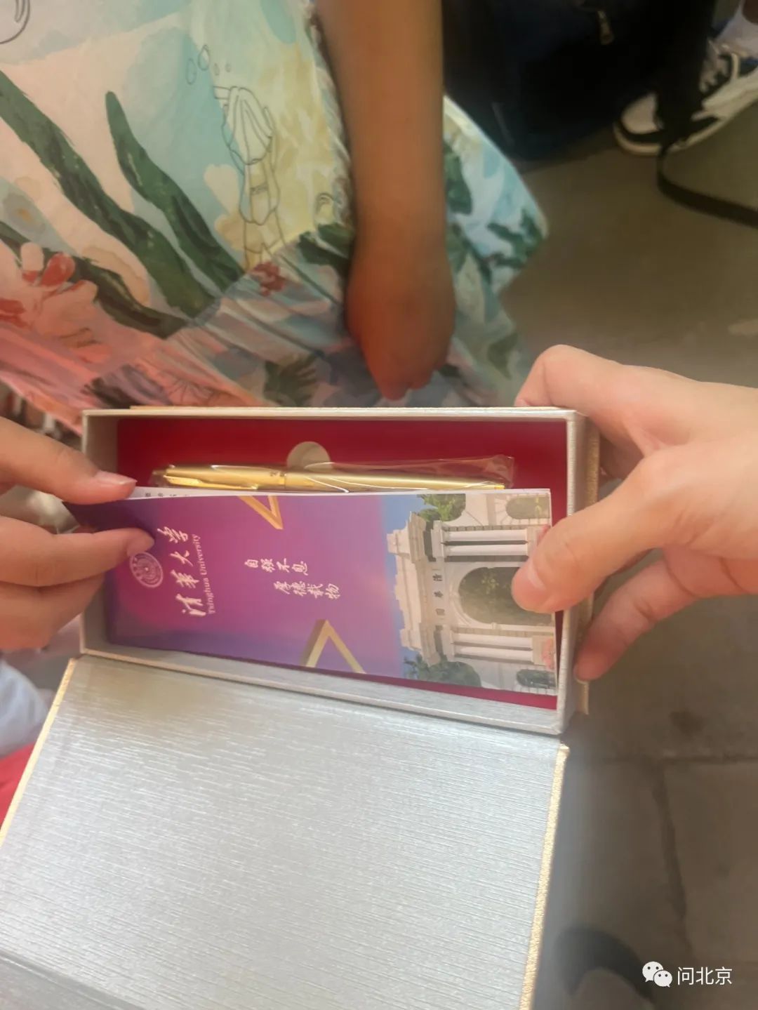 “演讲”持续了将近30分钟。随后,这位青年掏出了一本名为《清华北大状元篇》的小册子,以及一个附带清华、北大校徽的钢笔礼盒。他表示,这本书是他的学长学姐一起写成的,而钢笔礼盒是从清华校内文创店购买的,钢笔和书本售价一共是200元,可以成套购买、也可以单独购买。