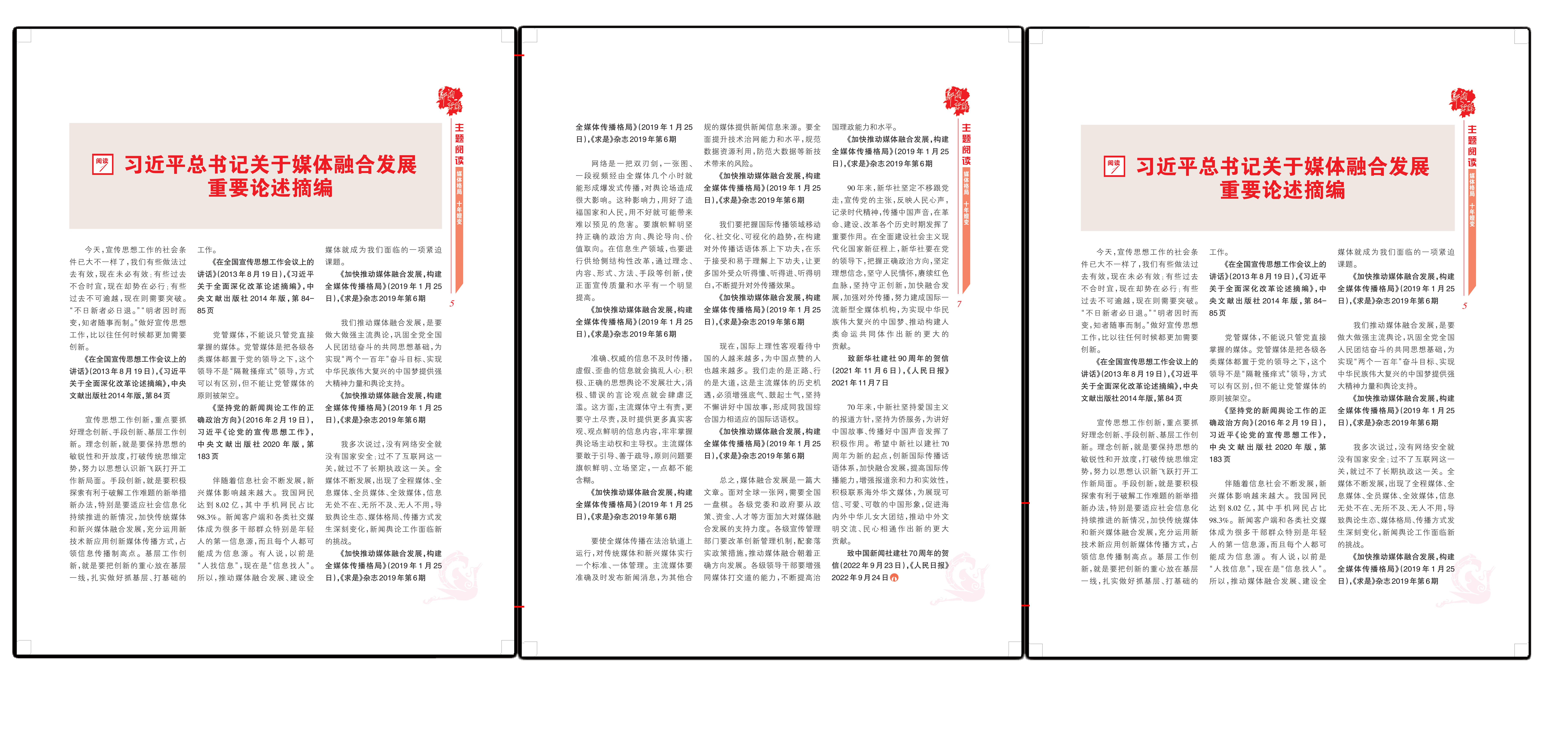 总之,媒体融合发展是一篇大文章。面对全球一张网,需要全国一盘棋。各级党委和政府要从政策、资金、人才等方面加大对媒体融合发展的支持力度。各级宣传管理部门要改革创新管理机制,配套落实政策措施,推动媒体融合朝着正确方向发展。各级领导干部要增强同媒体打交道的能力,不断提高治国理政能力和水平。