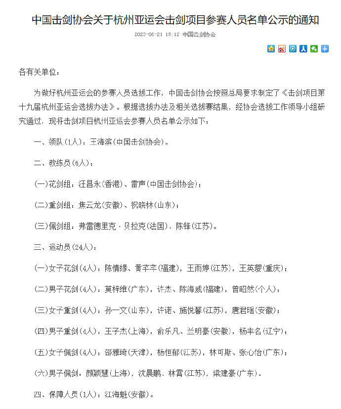 中国击剑协会官方公示击剑项目杭州亚运会参赛人员名单。