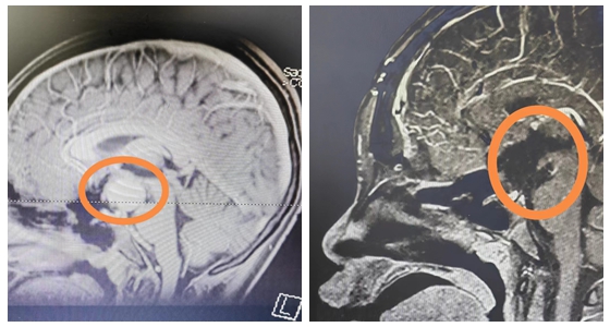 13岁的涵涵身高仅有145cm,体重37kg,比同班的男孩,甚至女孩都要矮小。起初,爸爸妈妈也没有太在意,以为孩子就是“长得晚”。2023年5月份开始,涵涵偶尔会跟爸爸妈妈说自己视物模糊,看不清,这时父母才重视,带涵涵到当地医院就诊。在医生的建议下查了颅脑MRI,问题果然出现在脑袋上,考虑:颅咽管瘤。为寻求手术治疗,涵涵在家长陪同下慕名来到湘雅常德医院神经外科就诊。