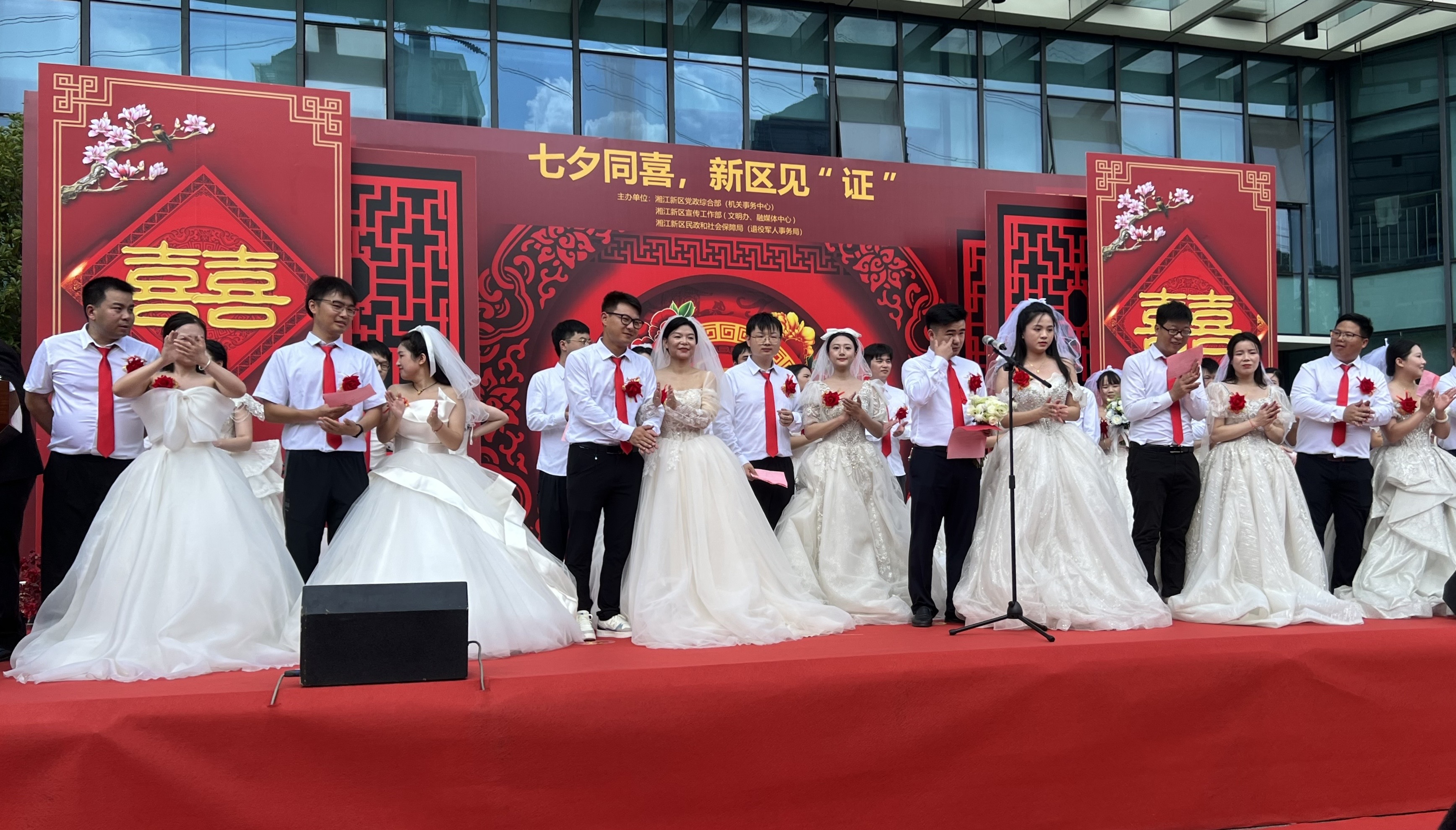 在湘江新区民政和社会保障局婚姻登记中心前坪,伴随着浪漫的婚礼进行曲,18对新人身穿婚纱礼服,在礼花和掌声中一步步走上红地毯,携手迈入“幸福之门”。当天,新区开展“七夕同喜·新区见‘证’”主题活动,特邀18对新人举办集体颁证仪式,共同宣读《结婚誓言》,倡导婚事新办、简办。