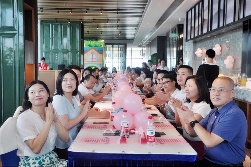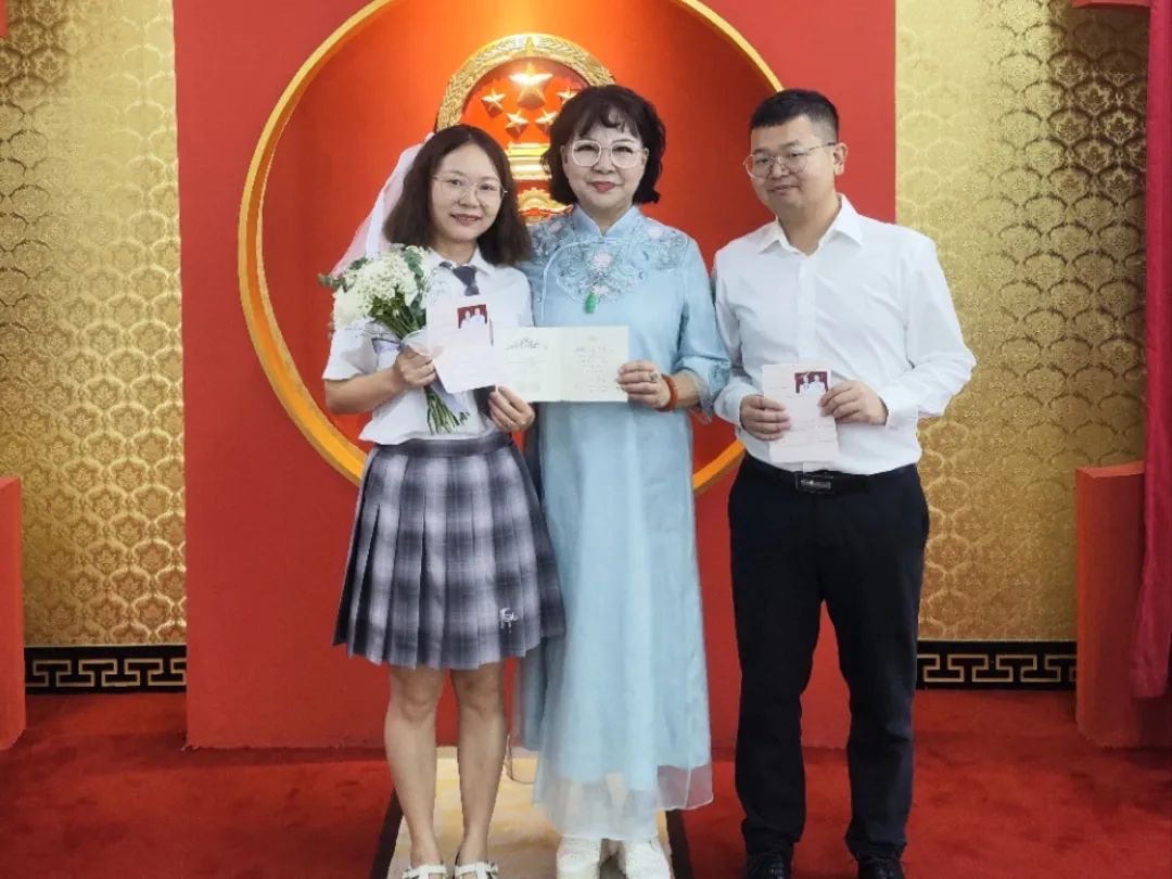 在庄严郑重的宣誓环节,长沙本地演员、《一家老小向前冲》“祝婶子”的扮演者刘赵黔笑盈盈地将两位新人的手叠在一起,为他们送上暖心祝福。“我看到一对对年轻人幸福地结成连理,我也很开心。祝他们永远相亲相爱一辈子。”刘赵黔笑着对记者说。
