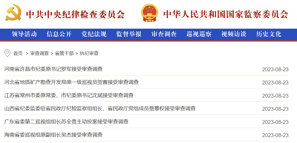 今天8时30分,中纪委网站发布消息,5个纪委“内鬼”同时落马。分别为:河南省许昌市纪委原书记罗军,江苏省常州市委原常委、市纪委原书记沈斌,山西省纪委监委驻省民政厅纪检监察组组长、省民政厅党组成员贾慕权,广东省委第二巡视组组长苏全贵,海南省委巡视组原副组长吴杰。
