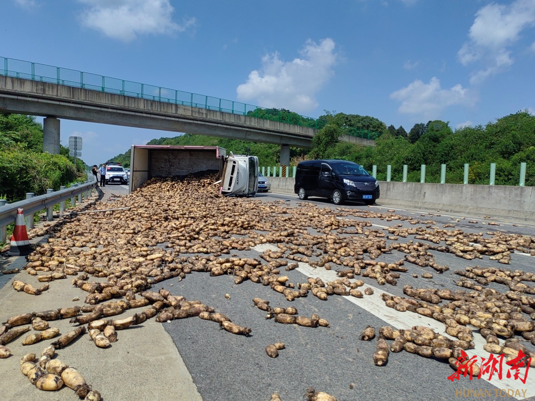 货车侧翻在高速路上,莲藕洒了一地。程宇权 摄