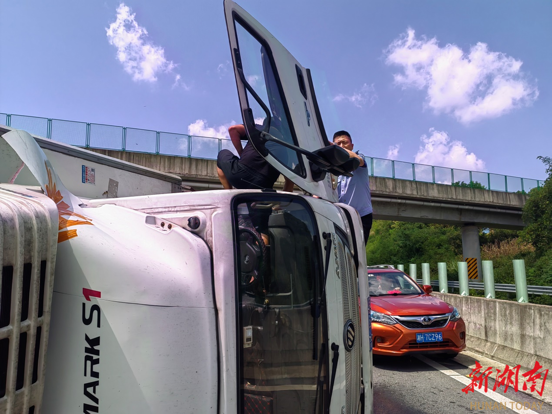 “不好,前面货车翻车了,赶紧停车!”8月22日下午,前往益阳市区开会的益阳市公安局交警支队大通湖大队大队长张军坐车行驶在华常高速沅江段时,前面一辆满载莲藕的大货车突然翻车,他立即要同行的交警程宇权紧急停车。“你赶紧给就近交警打电话,请求他们支援,去后备箱把锥桶拿出来,设置警戒带,我去看看司机怎么样了?”张军一边指挥程宇权设置警戒带,一边快速向货车跑去。当时气温高达38度以上,货车驾驶舱被太阳炙烤得很烫手,但张军顾不上这么多,加速爬上了已经侧翻的车头,奋力打开驾驶室车门。“师傅,你怎么样了?”“我还好,只是使不上劲,爬不出来。”“你赶紧把手给我,货车已经开始漏油了,我拉你出来。”张军紧紧拉着司机的手,用尽全力将司机拉出了驾驶室,并立即送到安全地带。此时接到报警电话的当地交警也赶到了现场。“司机身体只有一些擦伤,后面的事情就交给你们处理了,我下午3点的会,得赶紧走了。”张军跟当地交警简单交代了几句很快离开了现场。
