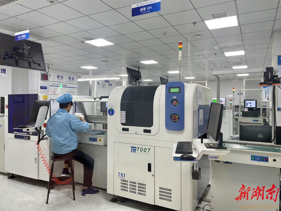 印刷、贴片、回流、检测……经过多道工序,一块块电路板源源不断下线。8月28日,记者走进位于长沙经开区的中电凯杰科技有限公司SMT(表面贴装技术)车间,只见5条生产线仅寥寥几人照看,生产运转却井然有序。在车间大屏幕上,生产进度、小时产出、不良原因等信息实时更新、一目了然。