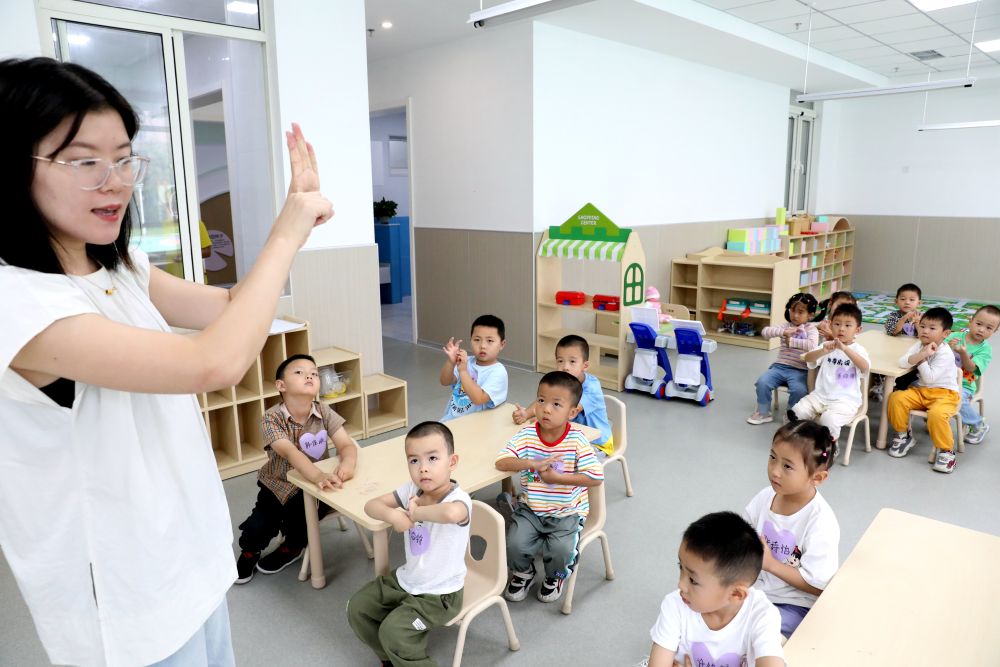 8月28日,在山东省青岛西海岸新区金河路幼儿园,老师在开学第一课中为幼儿讲解“七步洗手法”。