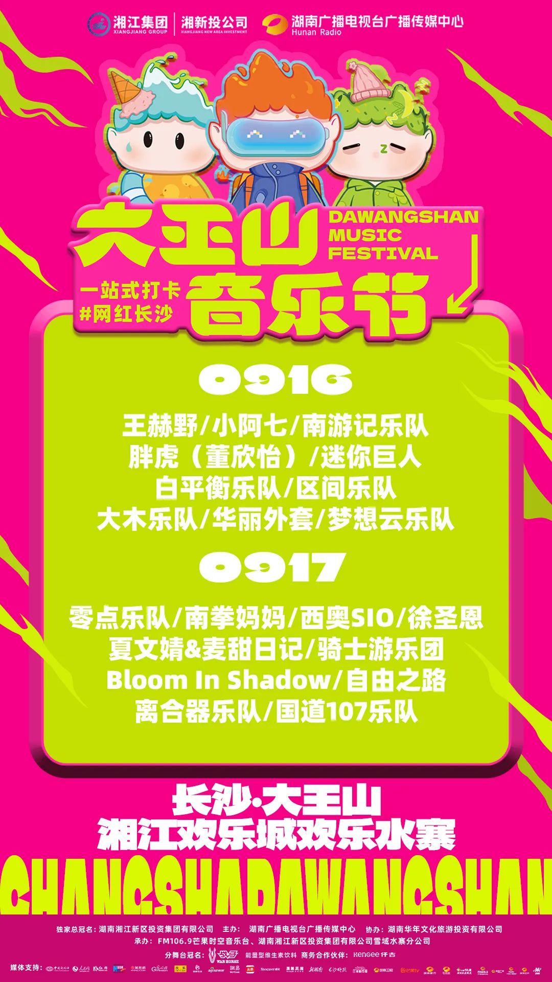大王山音乐节将于9月16日、9月17日落地长沙大王山湘江欢乐城欢乐水寨,王赫野、零点乐队、南拳妈妈、小阿七……还有近20支乐队将闪亮齐聚长沙大王山,多样曲风、极具长沙特色的演出阵容震撼来袭,一场专属长沙的水上音乐狂欢即刻上演。