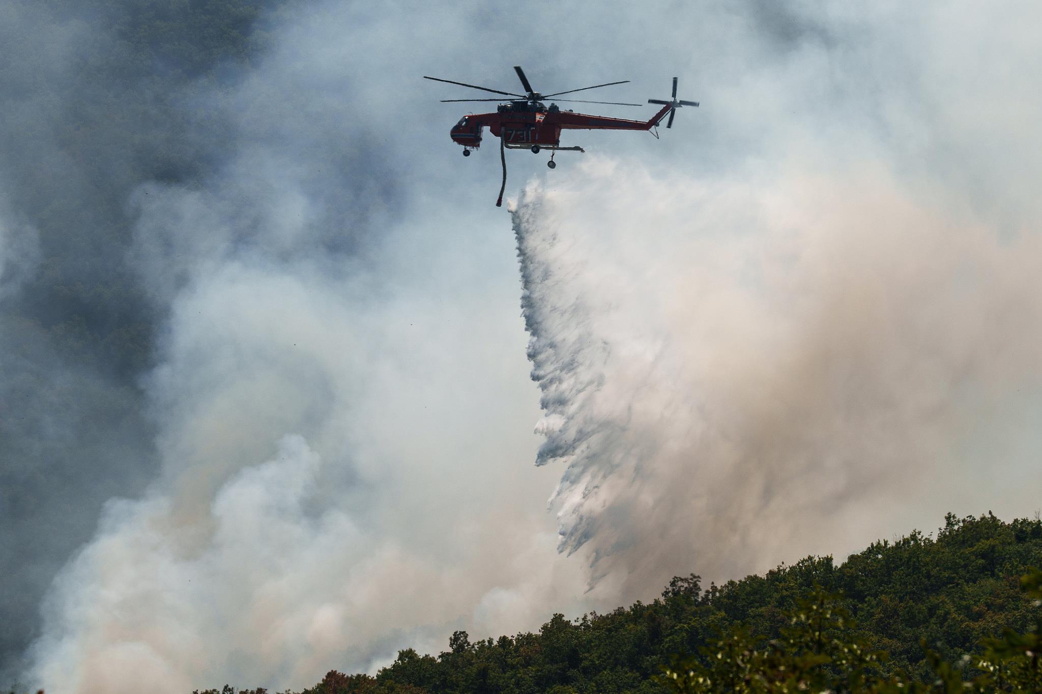 △当地时间8月29日,希腊埃夫罗斯地区达迪亚国家公园发生野火,消防直升机在灭火。