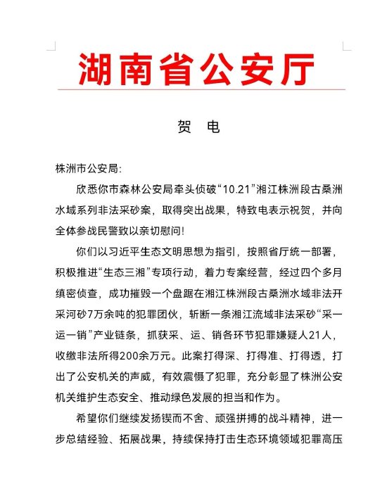案件侦破后,省公安厅向株洲市公安局发来贺电,表示由株洲森林公安牵头侦破“10.21”湘江株洲段古桑洲水域系列非法采砂案,取得了突出战果,并向全体参战民警致以亲切慰问!认为该局积极推进“生态三湘”专项行动,着力专案经营,经过4个多月缜密侦查,成功摧毁一个盘踞在湘江株洲段古桑洲水域非法开采河砂7万余吨的犯罪团伙,斩断一条湘江流域非法采砂“采—运—销”产业链条,抓获采、运、销各环节犯罪嫌疑人21人,收缴非法所得200余万元。此案打得深、打得准、打得透,打出了公安机关的声威,有效震慑了犯罪,充分彰显了株洲公安机关维护生态安全、推动绿色发展的担当和作为。