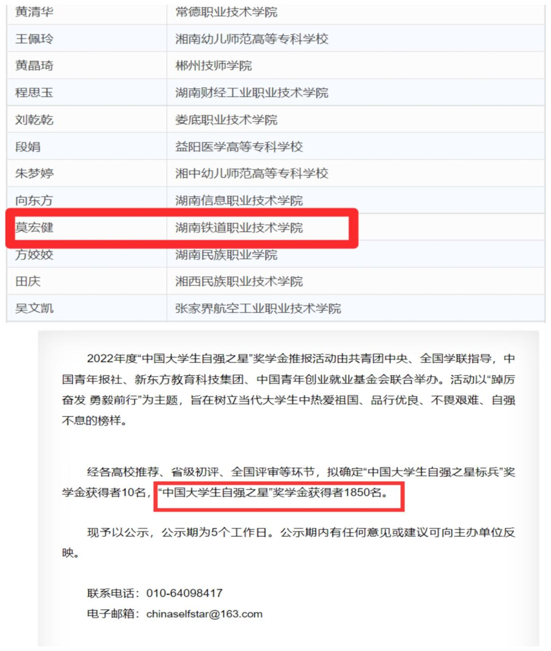 2022年度“中国大学生自强之星”奖学金推报活动由共青团中央、全国学联指导,中国青年报社、新东方教育科技集团、中国青年创业就业基金会联合举办。该活动旨在树立当代大学生热爱祖国、品行优良、不畏艰难、自强不息的榜样。经学校推荐、省级初评、全国评审等环节,拟确定“中国大学生自强之星”奖学金获得者1850名,湖南铁道学子莫宏健名列其中。