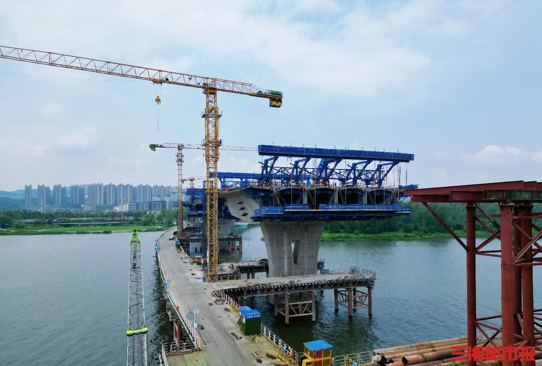 走进围挡,站在桥上远眺,南边是三汊矶大桥,北边是月亮岛湘江大桥,映入眼帘的是高高的匝道与正在进行主线桥梁施工的工人们。据介绍,项目共分为三个施工区域,河东和河西区域正在进行市政管线迁改及桥梁主体结构施工,水中区域正在推进主墩索塔及悬浇梁施工。