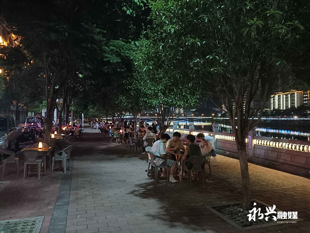 “河边非常凉快,来这里散步的人很多,河两岸灯光也非常漂亮,夜市广场做小生意的非常多,广场上每天晚上还有城管工作人员到这里值班,管理比较规范,卫生状况也相当不错。”一位姓刘的大爷每晚都会约三五好友来这里散步纳凉,对这里的环境赞不绝口。