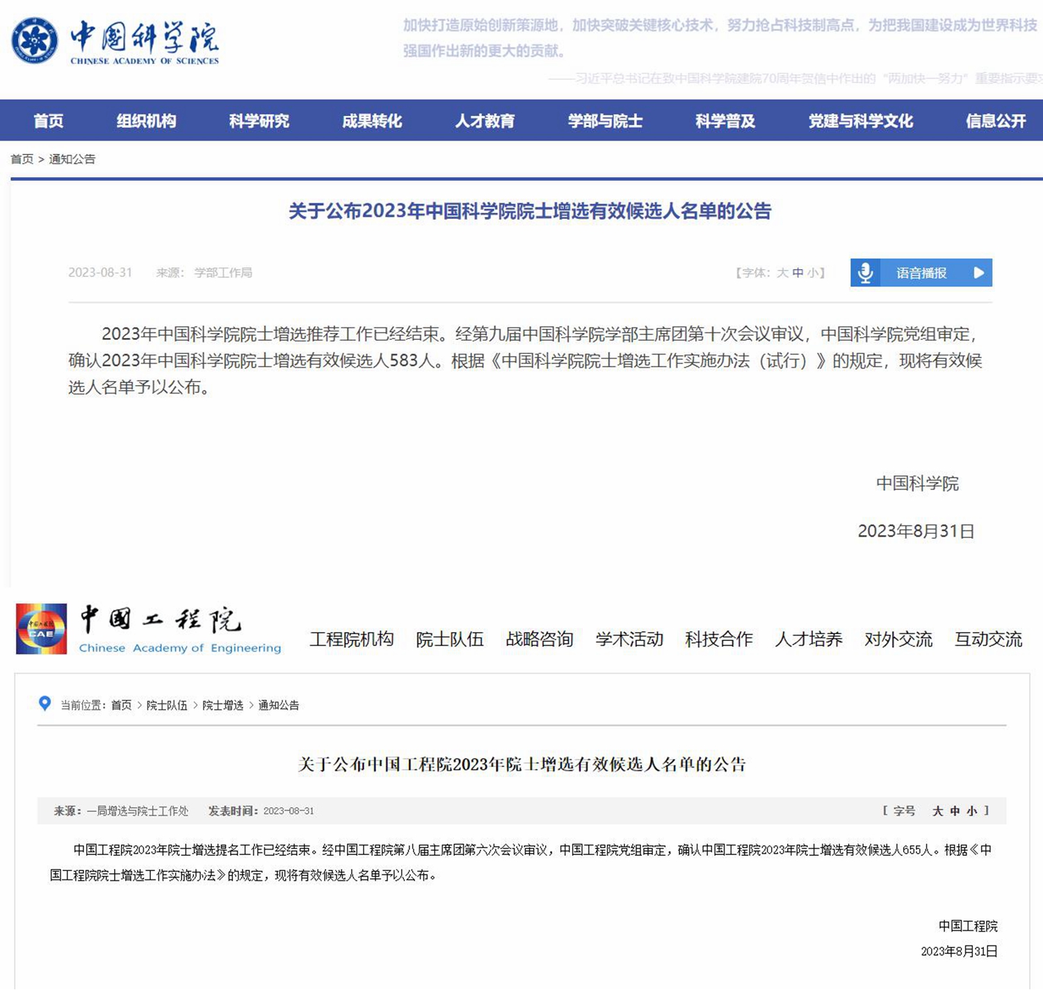 中新网北京8月31日电(袁秀月 韦香惠) 31日上午,中国工程院和中国科学院分别公布2023年院士增选有效候选人名单,中国工程院2023年院士增选有效候选人655人,中国科学院院士增选有效候选人583人。相比2021年,人数均有所增加。