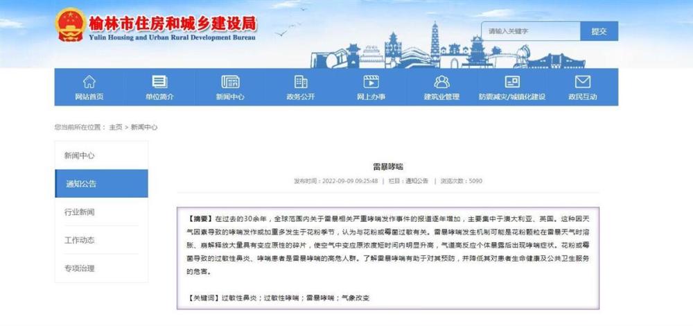 记者了解到,榆林市住建局曾经发布过一则科普性的公告称,在过去的30余年,全球范围内关于雷暴相关严重哮喘发作事件的报道逐年增加,主要集中于澳大利亚、英国。这种因天气因素导致的哮喘发作或加重多发生于花粉季节,认为与花粉或霉菌过敏有关。雷暴哮喘发生机制可能是花粉颗粒在雷暴天气时溶胀、崩解释放大量具有变应原性的碎片,使空气中变应原浓度短时间内明显升高,气道高反应个体暴露后出现哮喘症状。花粉或霉菌导致的过敏性鼻炎、哮喘患者是雷暴哮喘的高危人群。