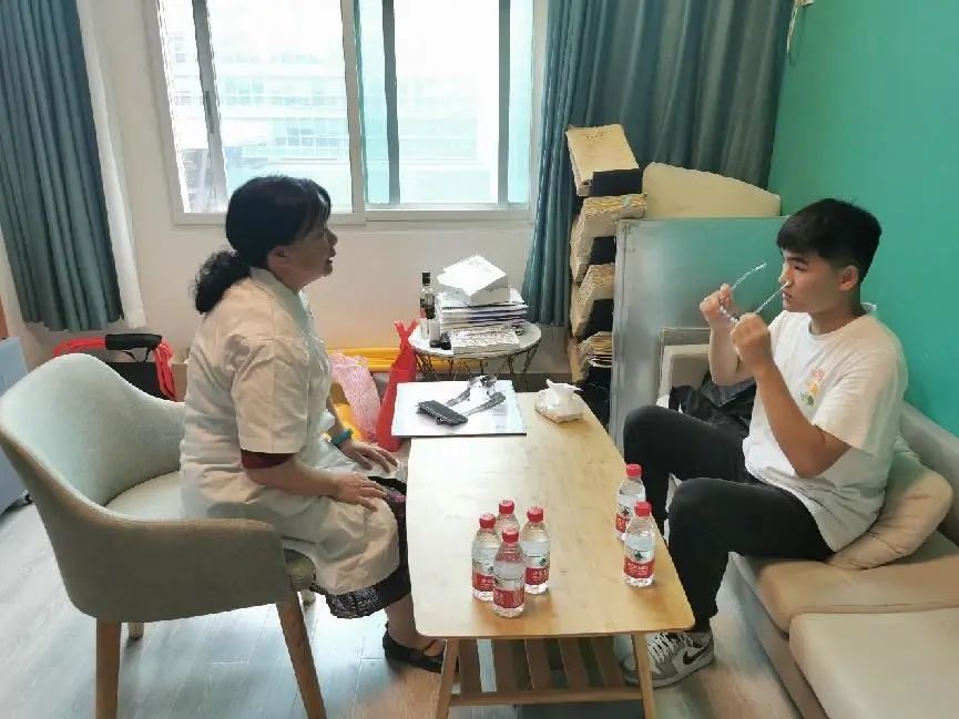 湖北省残疾人辅助器具资源中心负责人给尹宝玄测验视力。为方便他及时熟悉校园、融入生活,教育学院不仅为尹宝玄配备了学生骨干专人专班的全天候服务,提供“进校、进院、入宿、到堂”,还为他定制了大字号版入学材料,供他了解新生注意事项。