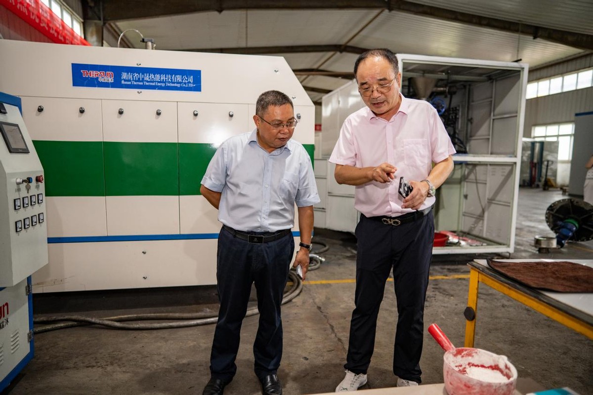 (湖南省中晟热能科技有限公司财务总监谢德义向建行工作人员介绍企业生产情况。)