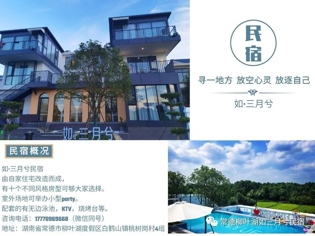 如·三月兮民宿由自家住宅改造而成,有十个不同风格房型可供大家选择。室外场地可举办小型party ,配套有无边泳池、KTV、烧烤台等。