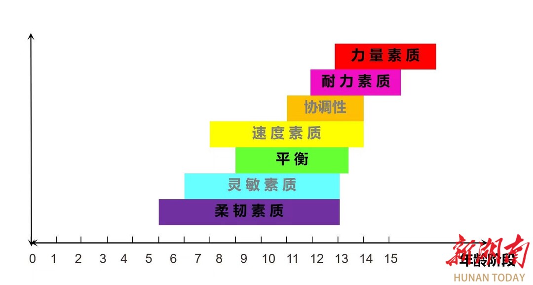 敏感期又被称做窗口期,是指特定能力和行为发展的最佳时期。各项身体素质的发展都存在窗口期,在所对应的时期内身体素质的发展相对迅速(如图)。身体素质发展的窗口期大多集中在儿童少年时期,如果错过了相应的窗口期,后期再想有较大程度的提升则事倍功半。对普通儿童少年而言,在其窗口期发展相应的身体素质,将会为日后各项运动技术的学习和运动能力的形成打下坚实的基础。