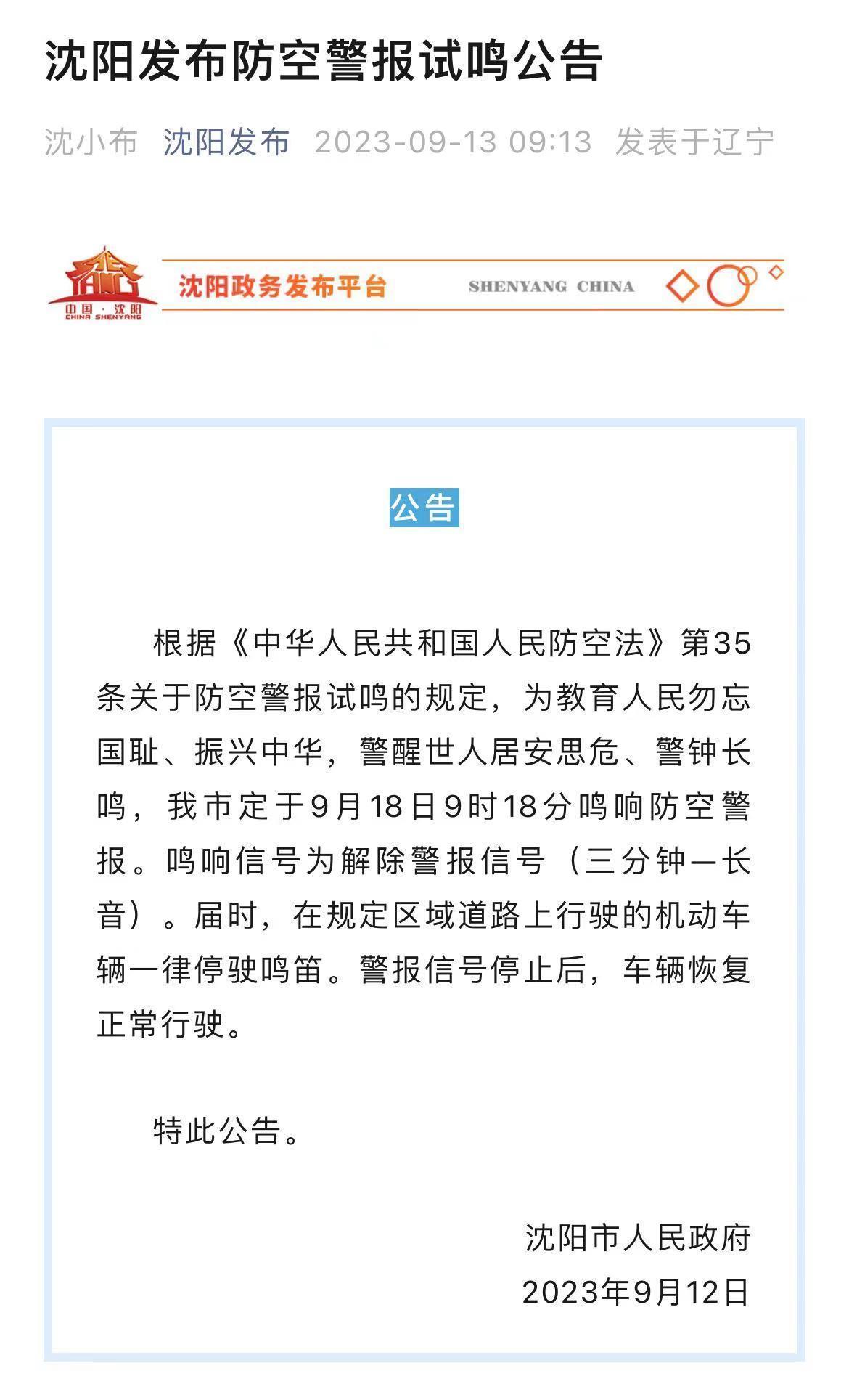 据沈阳市人民政府公告,为教育人民勿忘国耻、振兴中华,警醒世人居安思危、警钟长鸣,沈阳市定于9月18日9时18分鸣响防空警报。