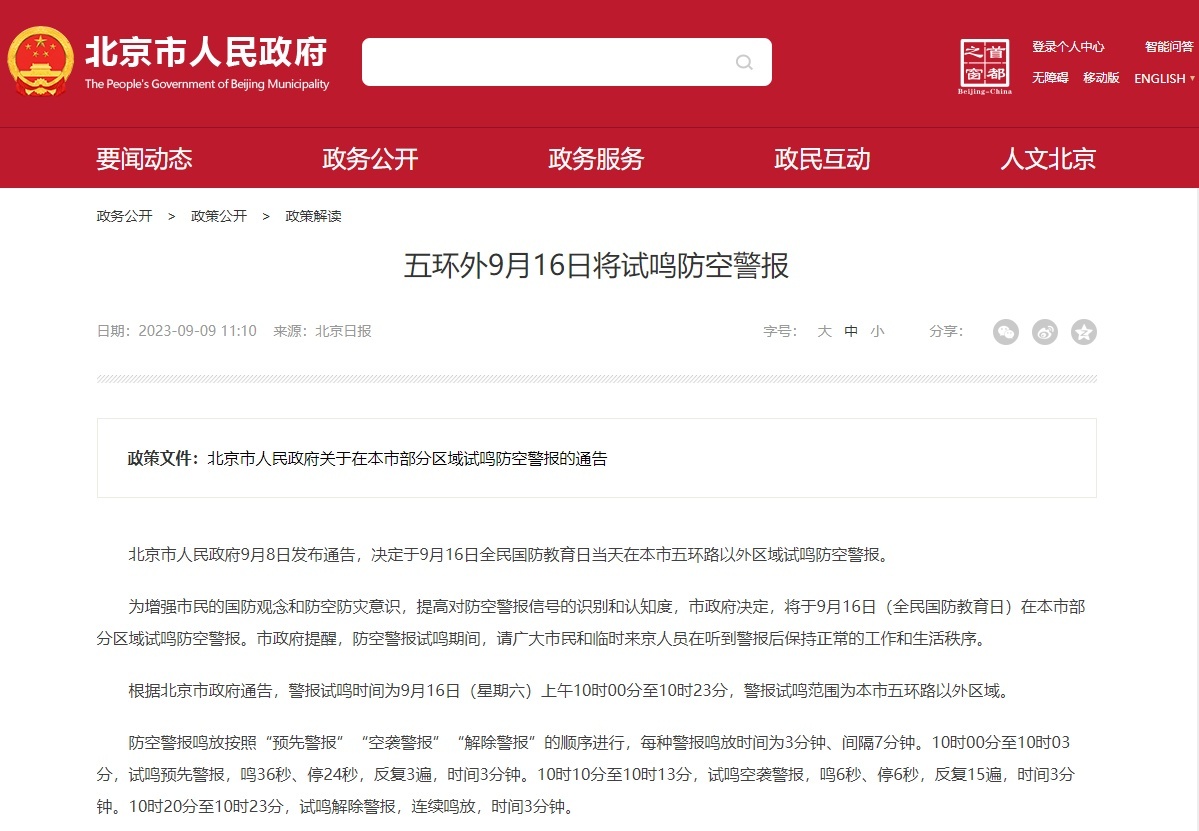 北京市人民政府9月8日发布通告,决定于9月16日全民国防教育日当天在本市五环路以外区域试鸣防空警报。
