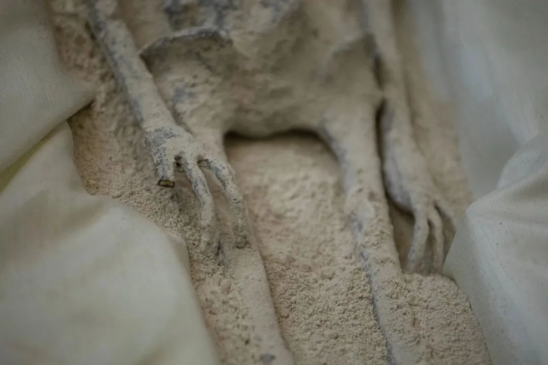 在当天的听证会上,墨西哥议会对外展出了两具疑似“外星生物”的遗骸。这两具遗骸于2017年在秘鲁被发现,距今分别有1800年和700年。遗骸的头部细长,每只手有3根手指。从遗骸中提取的DNA也显示,它们并非人类。