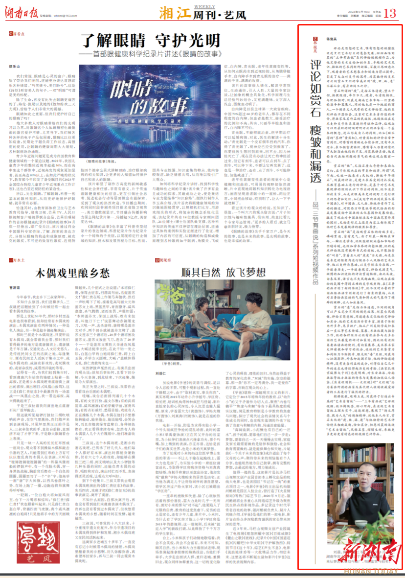 躬耕数载,艰难玉成。刘晨终于打造出专属的“艺术自留地”——“三爷有画说”艺评短视频。他不拘绳墨,初心所向,在这块艺术自留地上埋头实干,追逐理想,展现了“扬文厚德、敢为人先”的湖湘精神。就他本人而言,赏石文化的“瘦、皱、漏、透”与他独特的艺术评论特点相映成趣,恰如其分。但愿刘晨的这块“艺术自留地”,风雅互鉴,熠熠生辉,奉献更多更好更有特色的短视频艺评作品。