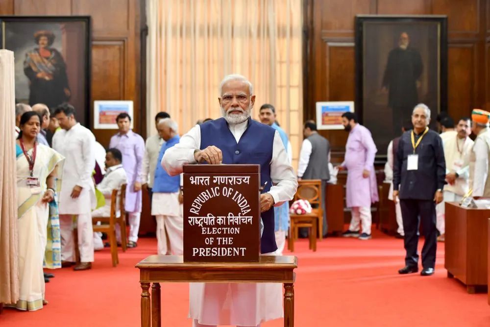图为2022年7月18日,印度总理莫迪在新德里参加总统选举投票。新华社/印联社