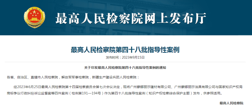 记者9月15日从最高人民检察院获悉,最高检近日以“知识产权检察综合保护”为主题发布了第四十八批指导性案例。此次发布的指导性案例共4件,分别是:广州蒙娜丽莎建材有限公司、广州蒙娜丽莎洁具有限公司与国家知识产权局商标争议行政纠纷诉讼监督案;周某某与项某某、李某某著作权权属、侵权纠纷等系列虚假诉讼监督案;梁永平、王正航等十五人侵犯著作权案;上海某公司、许林、陶伟侵犯著作权案。