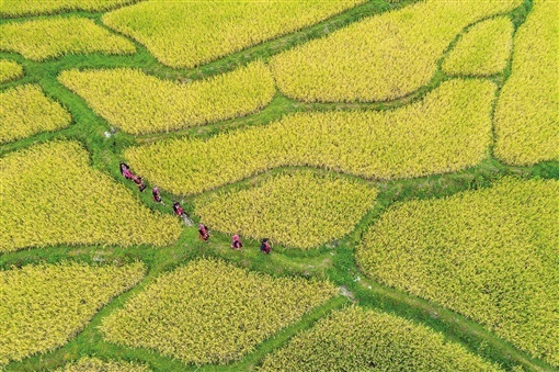 莽山瑶族乡道洞村的村民行走在丰收的稻田中。邓加亮 摄