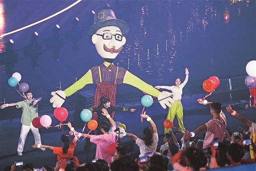 舞台还跨过了山海。香港演员、歌手张柏芝与魔动闪霸唱着《漫漫人生路》,穿过翠江边汇集郴州美食和粤港澳小吃的郴州夜市,带着烟火气踏上舞台,与“搭乘”极具大湾区特色的“观光巴士”来到现场的张卫健、白举纲共唱《万水千山总是情》《MONICA》《朋友》等经典粤语金曲,开启一场热烈的嗨歌演唱会,引领全场大合唱。“繁星流动,和你同路,从不相识,开始心接近……”《朋友》的旋律,唱出了郴州与大湾区跨越山海的情谊,唱出了郴州作为湖南走向大湾区桥头堡的开放气质和对更大舞台的期待。