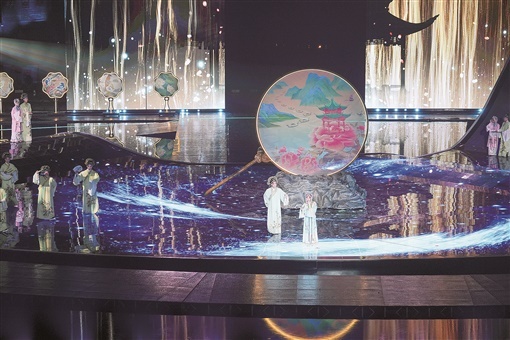 以天为幕,踏水而歌。水不仅是郴州的优势资源,也是这次开幕式的“主角”。除背后的翠江,主舞台前面也被水环绕,当演员的舞步激起的层层涟漪在灯光映照下四散开时,舞台与翠江联动起来。在郎朗与林喆、冯天石合奏的中西结合的嘉禾伴嫁歌《逗》中,演员甚至以玻璃器皿盛装水作为击打乐器,奏响“山水协奏曲”。这何尝不是生态文明的节奏?