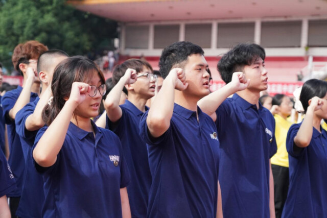 在领誓人的带领下,2023级新生们宣读誓言,铮铮之声表达了“请党放心,强国有我”的决心。