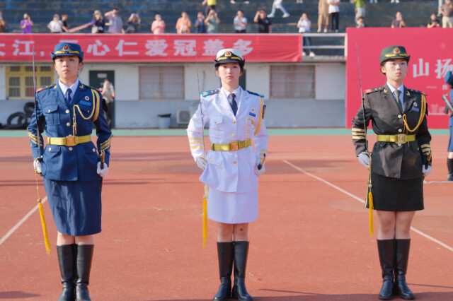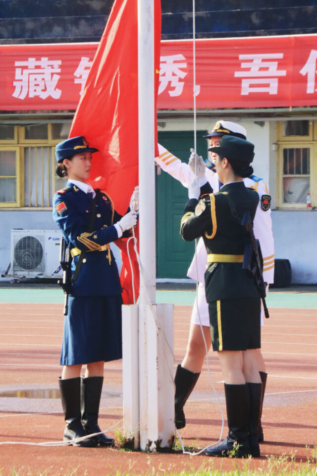 开学典礼在庄严的国歌声和激昂的校歌声中拉开帷幕。校女子国旗护卫队队员们手握钢枪,英姿飒爽,迈着整齐的步伐出旗护旗。着学校统一配发文化衫的全体2023级新生,庄重热烈,麓山扬帆,青春起航。